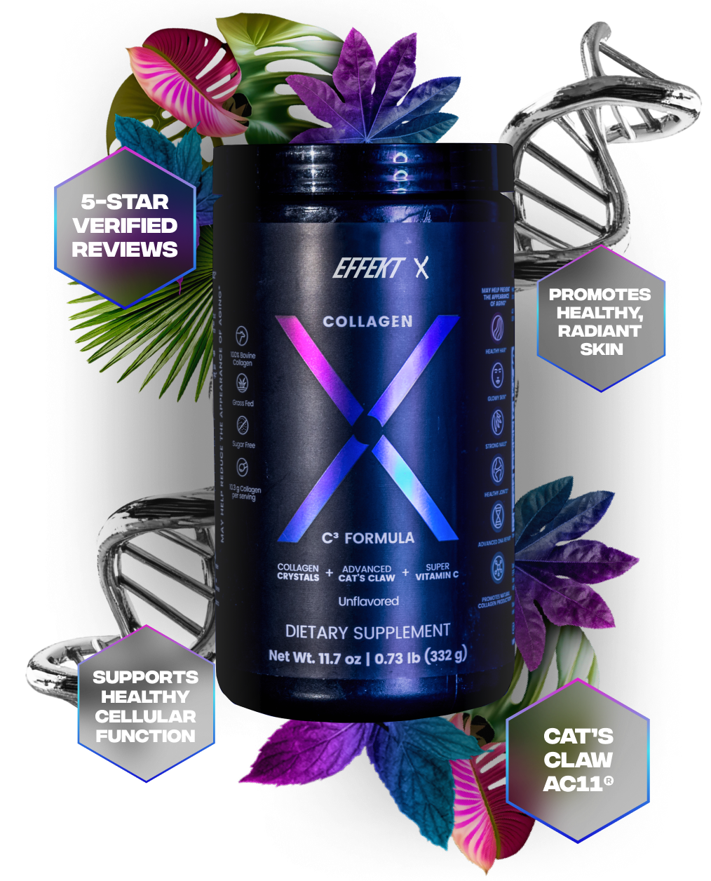 EFFEKT is a skincare-focused bioscience brand devoted to advancing healthy-looking skin through evidence-based innovation. Our Collagen X formula combines a patented plant extract, high-purity collagen, and Vitamin C to help support natural collagen formation and maintain radiant, supple skin over time.